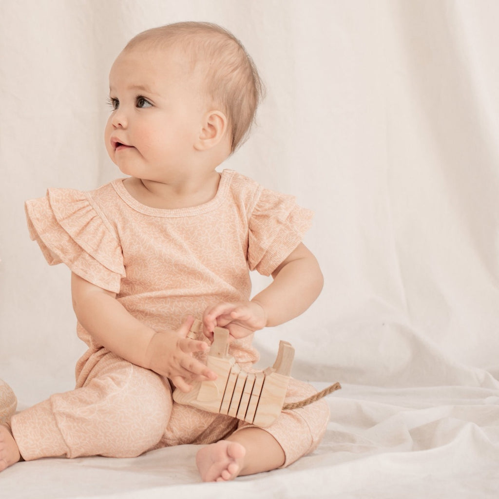 Beautiful short sleeve playsuit featuring double ruffles on the shoulder.  Features snaps on the legs and shoulder for easy changes.  Made from soft ribbed cotton in Dusty Pink Floral.