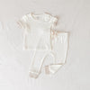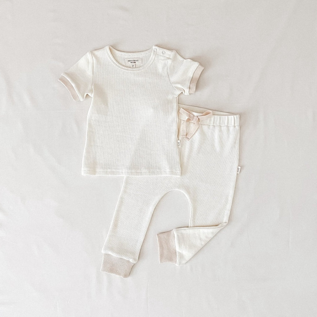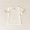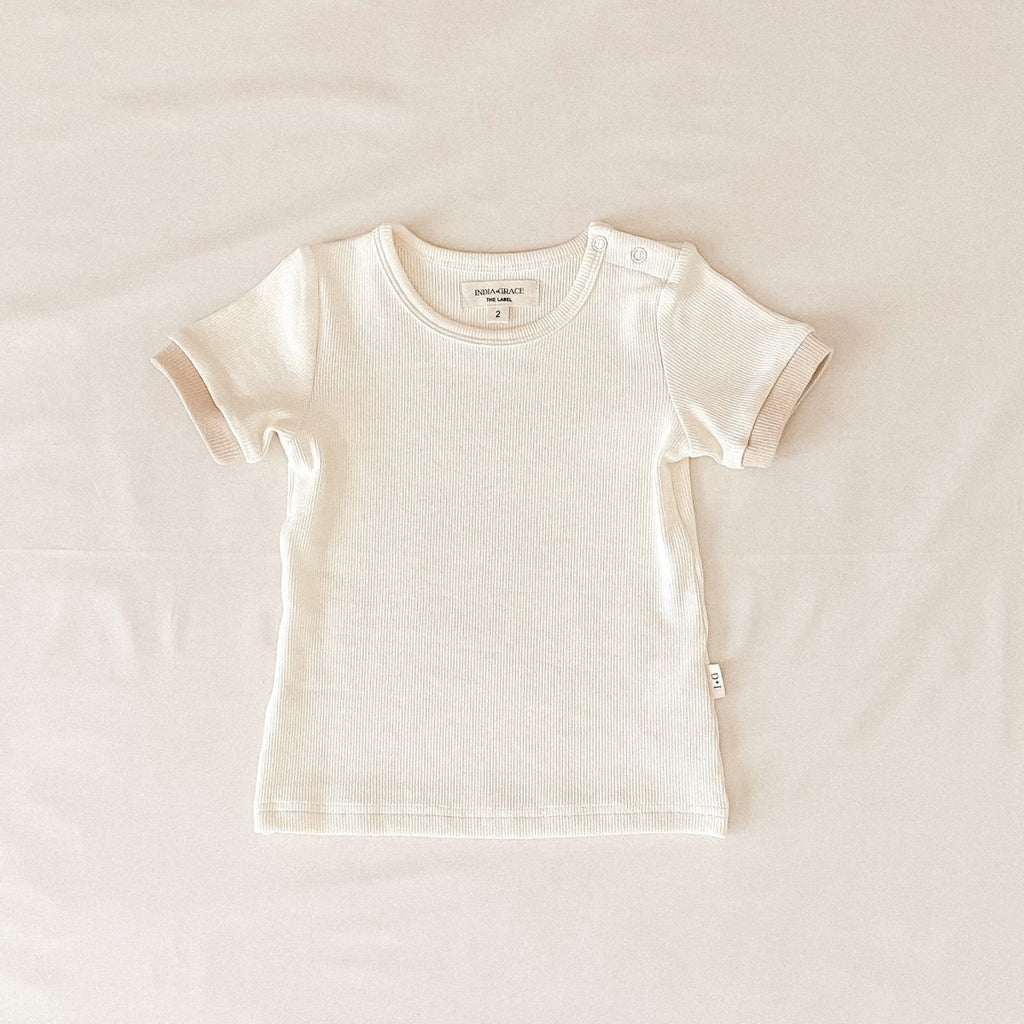 Short sleeve tee in cream super soft ribbed cotton. Featuring hazelnut cuffs and snaps on the shoulder for easy changes.