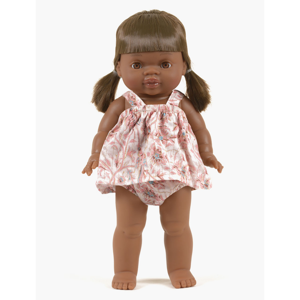 The Gordis are growing up! Meet Salome; an exclusive Minikane standing doll. Made in Spain and guaranteed phthalate-fee, Salome has light brown hair styled in pigtails with cute bangs and brown eyes. She comes dressed in a “Mila” outfit in light Assia cotton made in Minikane's Parisian workshop, using Okeo-Tex certified fabrics.