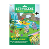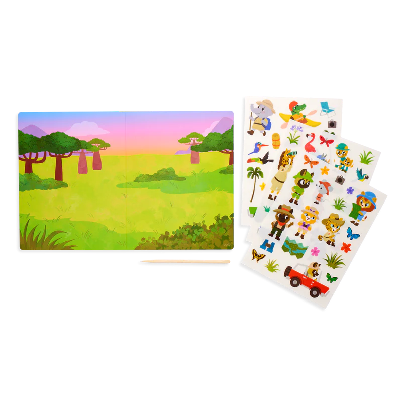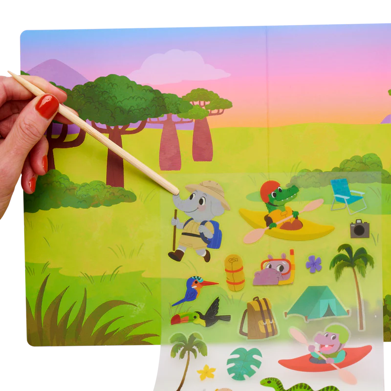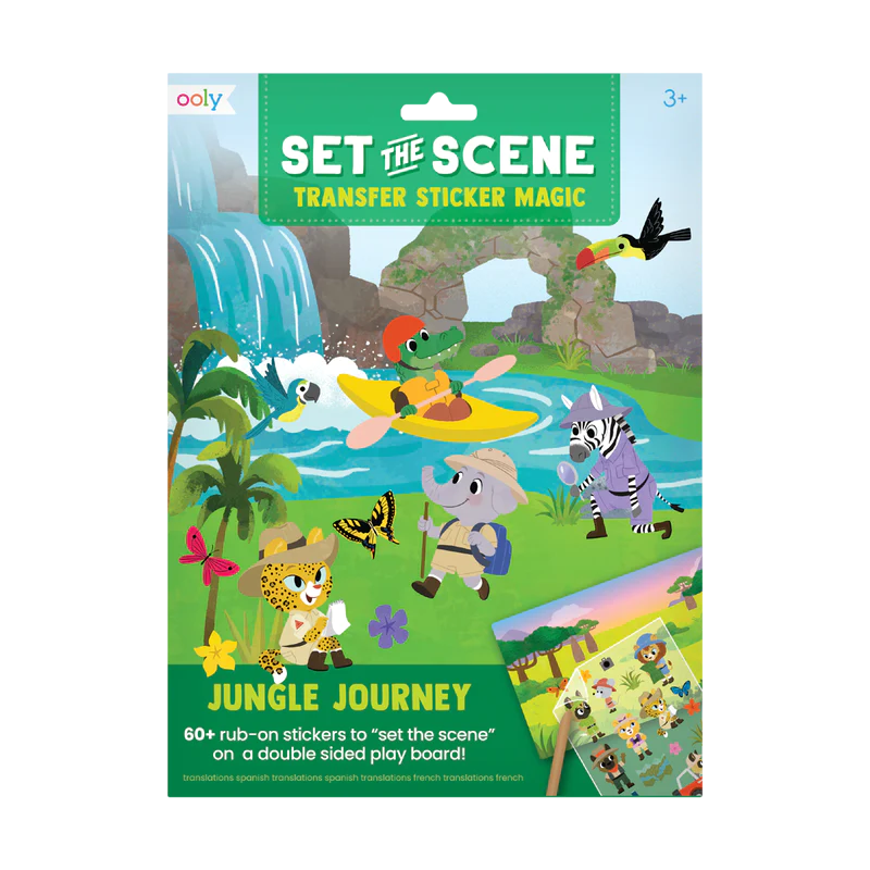 Entice your little explorer to take a journey into their imagination with this Set The Scene Jungle Journey transfer stickers kit. This playful kit comes with a double-sided jungle-themed playboard and 60 rub on transfer stickers. Your child is sure to be inspired to create their own adventure simply by applying the animal stickers wherever they choose. This kit even includes a wooden transfer tool, making it easy to place the stickers exactly where the story dictates! Suitable for ages 3 and up.