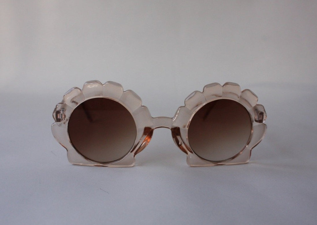 Fun, shell shaped children's sunglasses in a pretty peach shade. Features brown UV 400 lens.