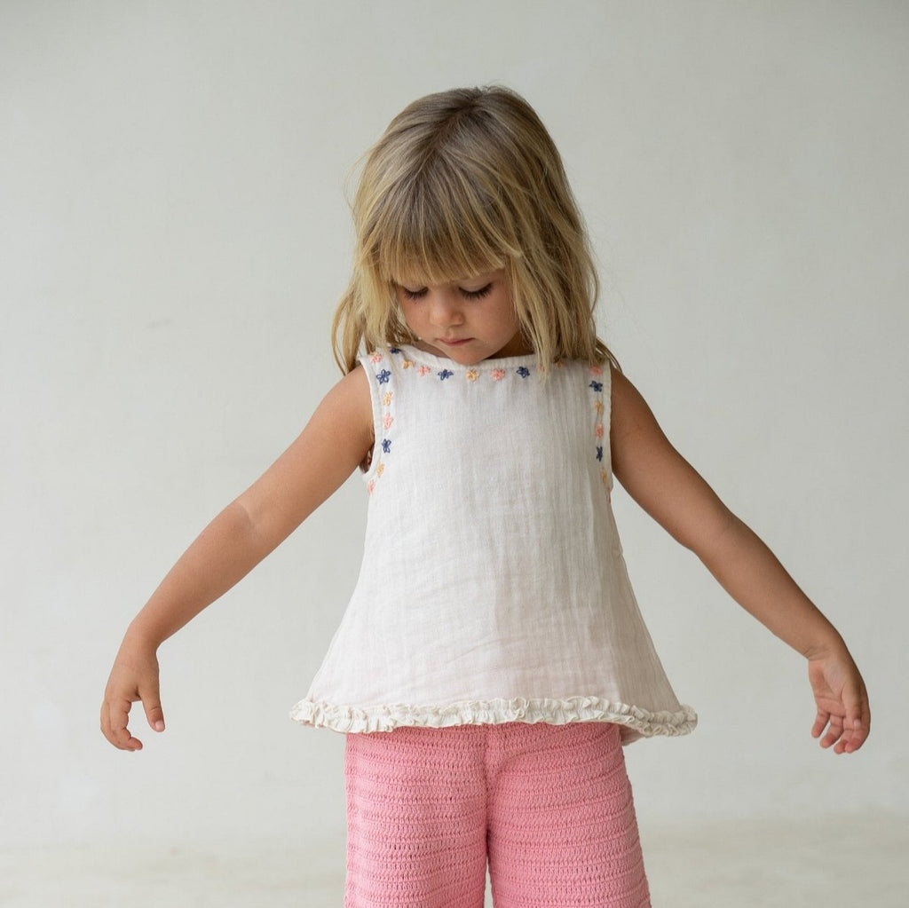 Our sweetest swing top is here, elevated by our beautiful hand-embroidered floral trim and baby locked frill details. This style features shell buttons at the back and a sleeveless design. It is designed to integrate effortlessly with pieces from previous collections or your little ones favourite bottoms.