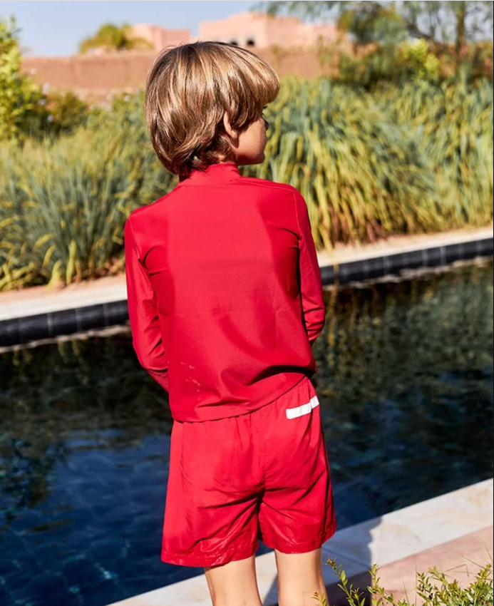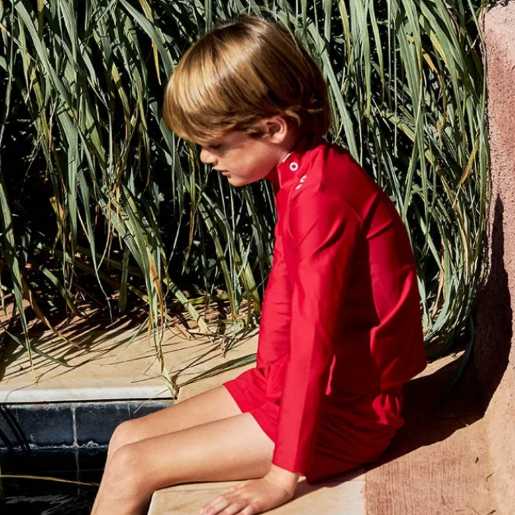 This Pepper red, gender neutral sun protective rashguard will completely change the way you see UV protective swimwear. Made from recycled fiber, it filters 98% of harmful rays with no chemical filter. It is ideal for boys, girls and babies alike. Its three pressure caps make it extra easy to slip on, making this perfect piece both eco-friendly and stylish.