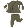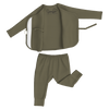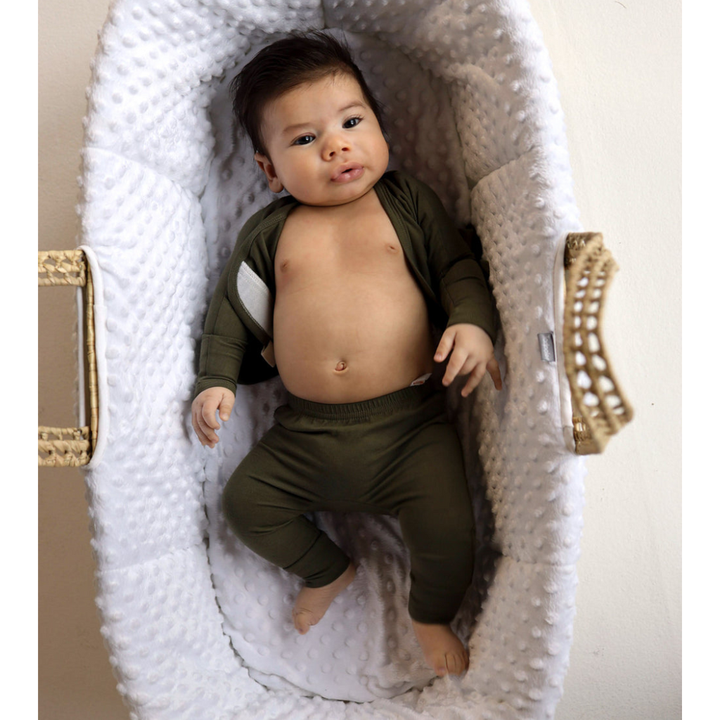 Two double layered flaps are fastened together with ultra soft hook and loop fasteners. Once the two flaps are open, the baby's chest and belly are fully exposed for skin to skin connection. The elastic waistband allows for easy dressing and (as easy as they can get) diaper changes.