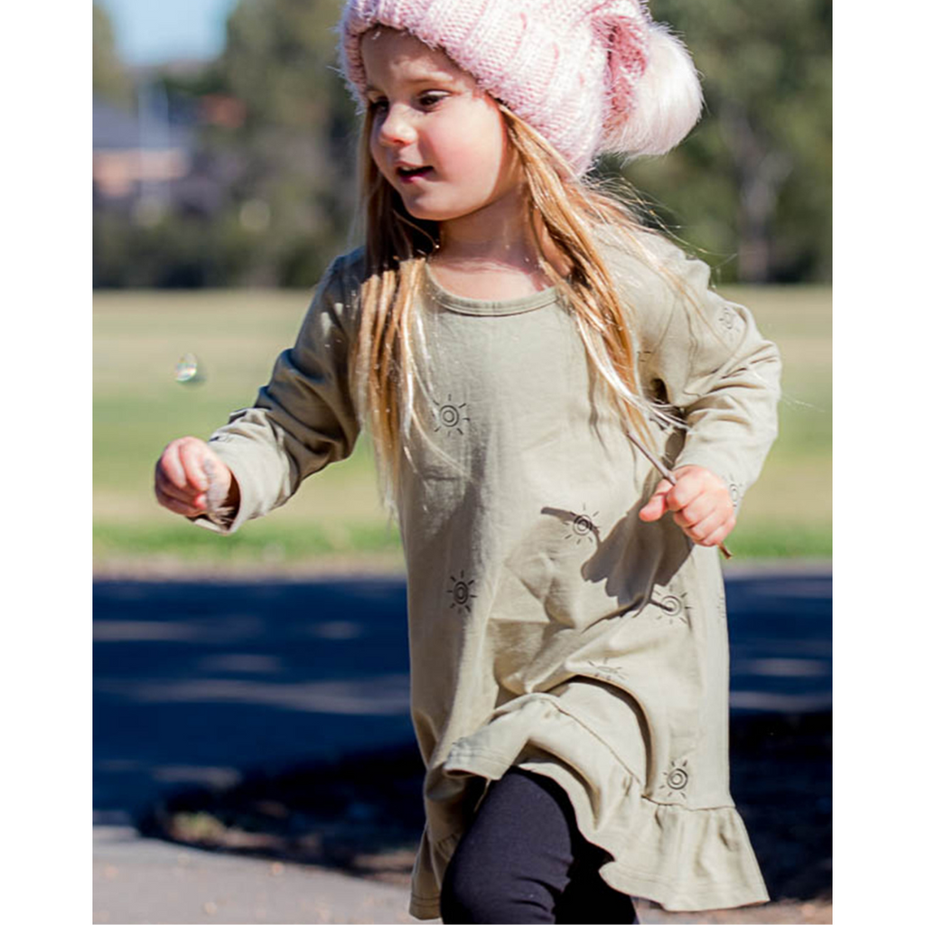 Comfortable olive dress with black sun print.